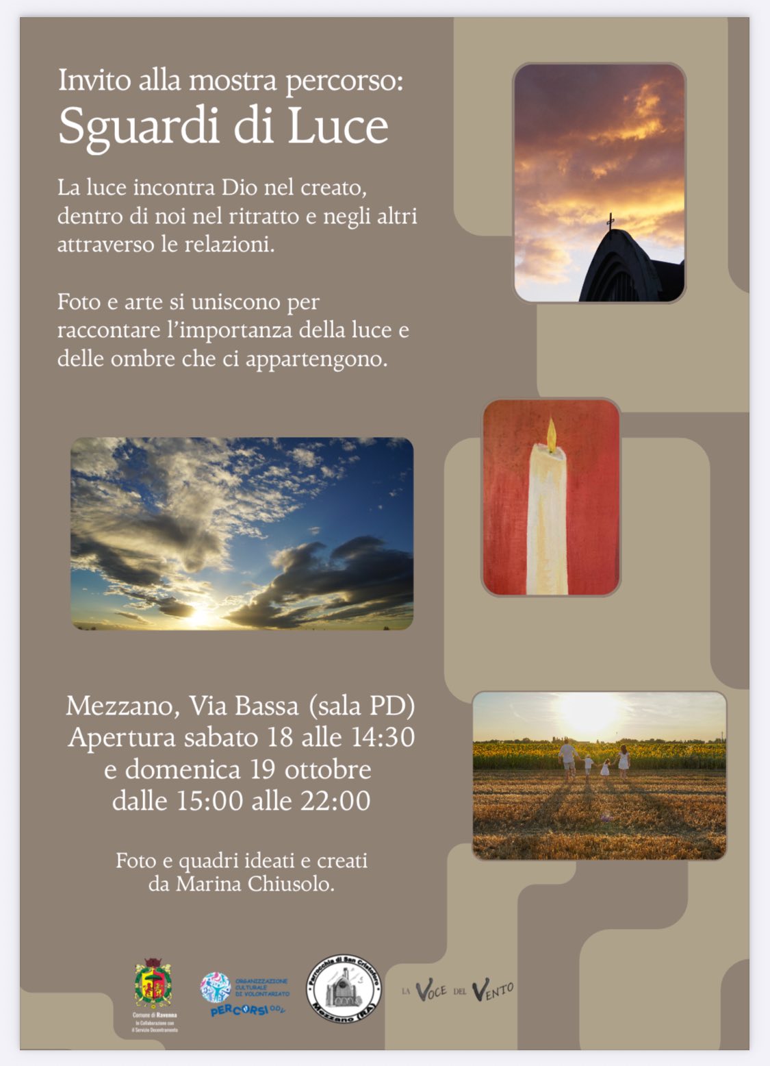 - Ore 14,30 presso Sala PD via Bassa, Apertura mostra "Sguardi di Luce", di Marina Chiusolo.