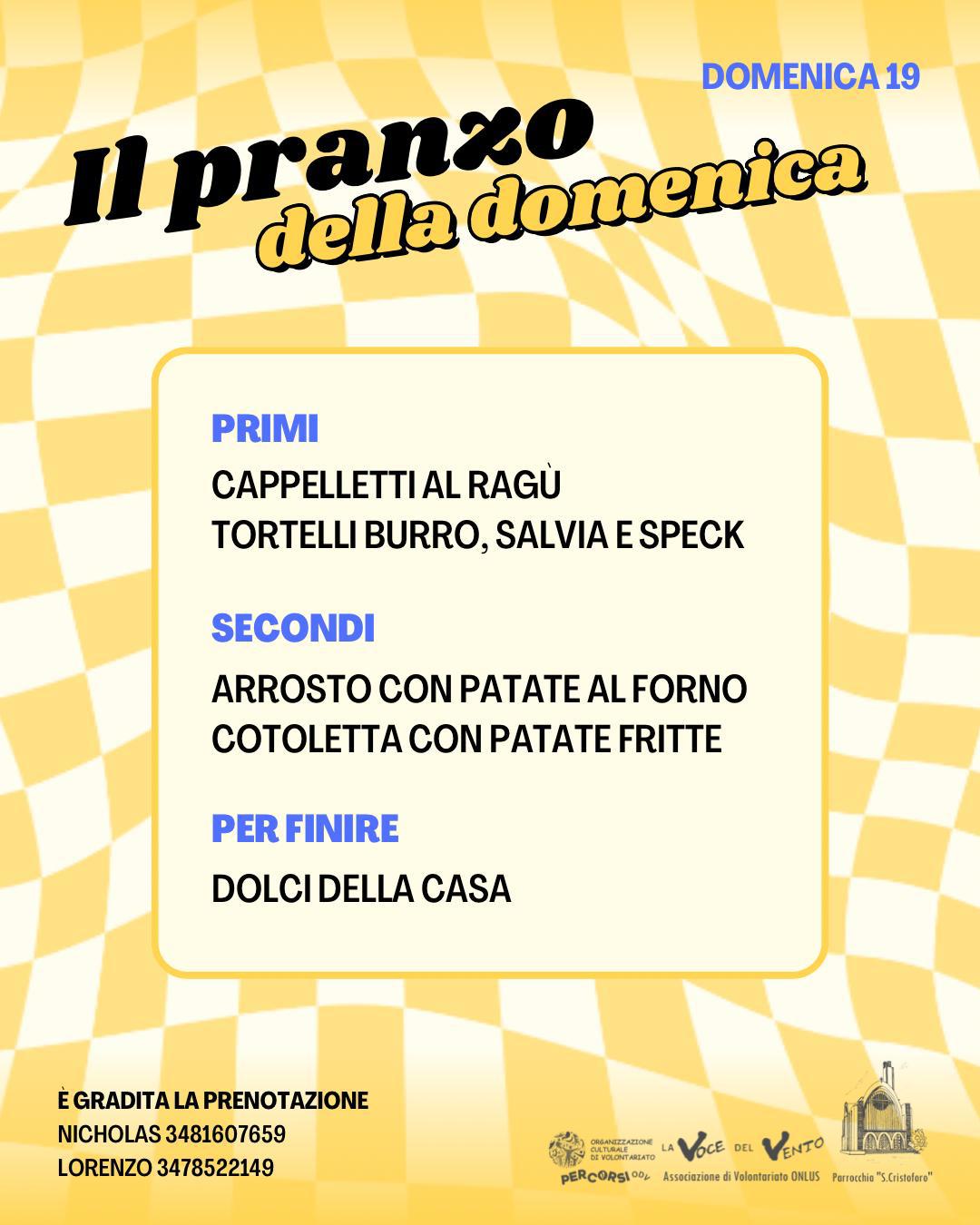- Ore 12.00 presso lo stand gastronomico parrocchiale: Pranzo della festa (su prenotazione)